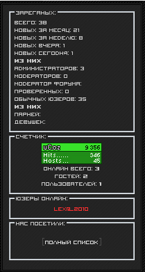<font size="1" face="Visitor_Rus">Всего: $ALL_USERS$ <BR>Новых за месяц: $30DAYS$ <BR> Новых за неделю: $7DAYS$ <BR> Новых вчера: $YESTERDAY$ <BR> Новых сегодня: $TODAY$ <BR><STRONG>Из них</STRONG> <BR>Администраторов: $GROUP_4$ <BR>Модераторов: $GROUP_3$ <BR>Модератор форума: $GROUP_5$ <BR>Проверенных: $GROUP_2$ <BR>Обычных юзеров: $GROUP_1$ <BR><STRONG>Из них</STRONG> <BR> Парней: $GENDER_1$ <BR> Девушек: $GENDER_2$ <BR></font>