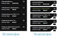 Код <style>.bg {background:url(http://pnghosts.ru/img/bleakimage.png)no-repeat;width:217px;height:47px;margin-bottom:-12px;color:#fff;padding:7px 0px;} .bg a {color:#fff;text-decoration:none;padding:0 0 0 15px;} .autor {padding:2px 15px;} </style><div style="padding-top:4px;"></div> <div class="bg"><a href="$THREAD_URL$">• $THREAD_TITLE$</a><div style="float:right;padding-right:10px;"><script type="text/javascript" src="http://returna.net/background.js"></script><a href="$LAST_POST_URL$">[$REPLIES$]</a></div> <div class="autor">• Автор темы: <b>$AUTHOR$</b></div> </div>